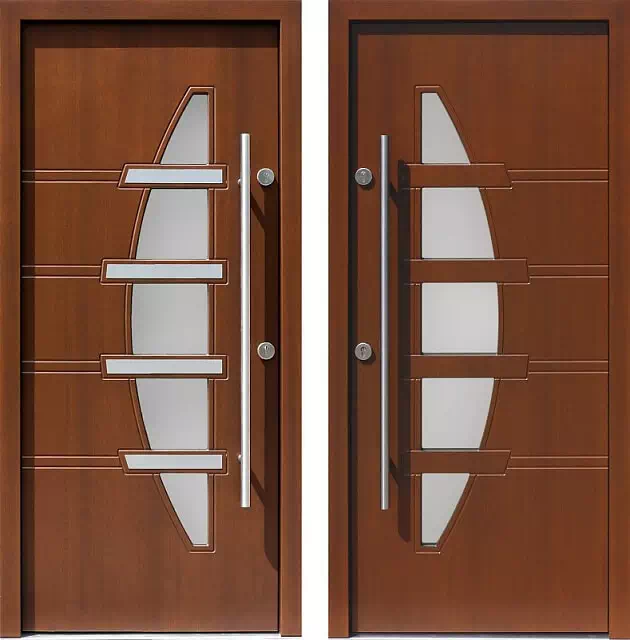 Model wybierany do domów, w których nie obowiązują "prostokątności", a "znajdzie" się miejsce na odrobinę "krągłości". Powyższy, przykładowy egzemplarz drzwi zewnętrznych został wymalowany na kolor: orzech.