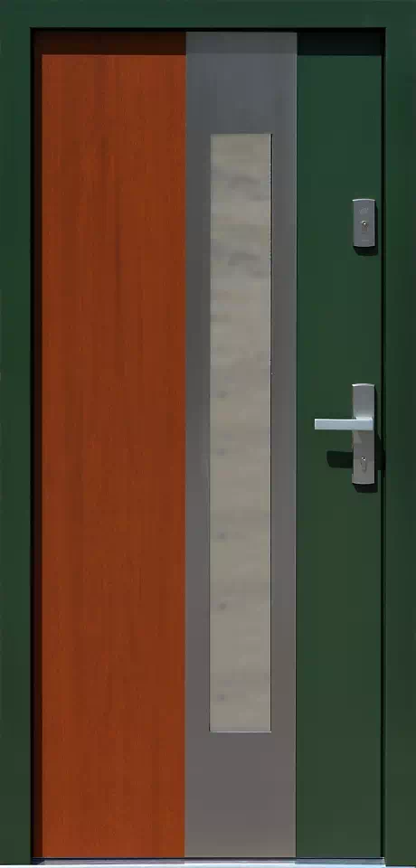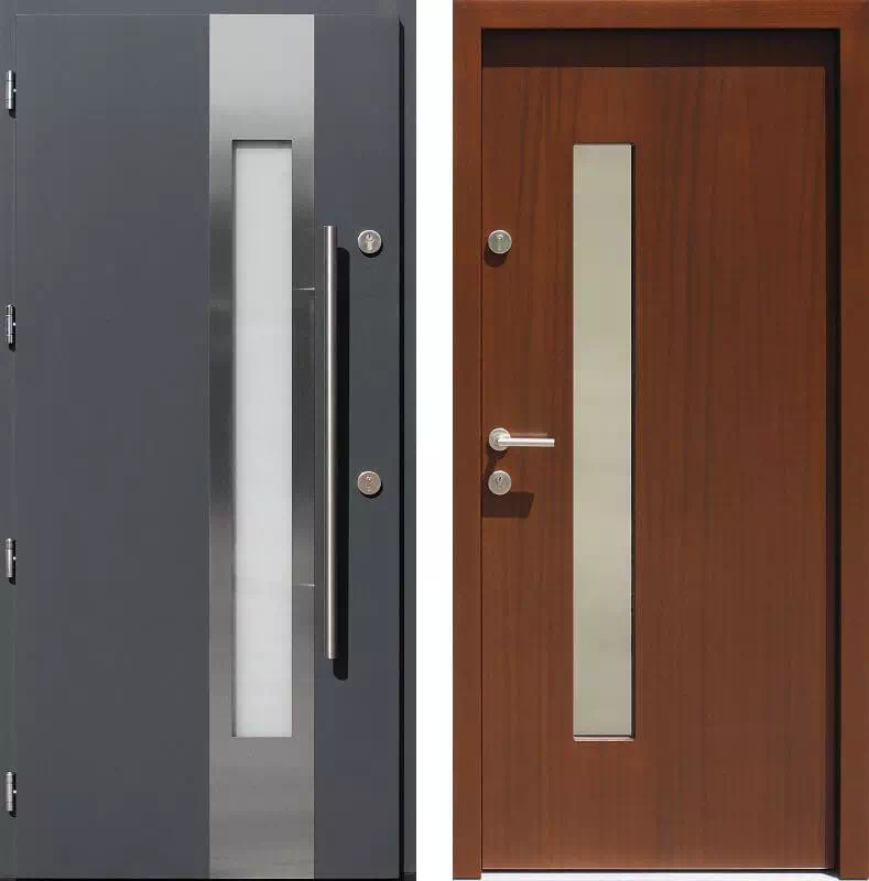 Szyba o dużych wpuszcza dużo światła do wnętrza domu oraz daje możliwość łatwej obserwacji otoczenia przed drzwiami z wnętrza domu. Alternatywnie zastosowany pochwyt rurowy ze stali nierdzewnej (w tej konkretnej prezentacji o długości 120 cm) dodaje drzwiom nowoczesnego stylu. Blacha nierdzewna w tym modelu jest nakładana na płaszczyznę skrzydła. Powyższy, przykładowy egzemplarz drzwi zewnętrznych został wymalowany na kolor: antracyt + orzech.