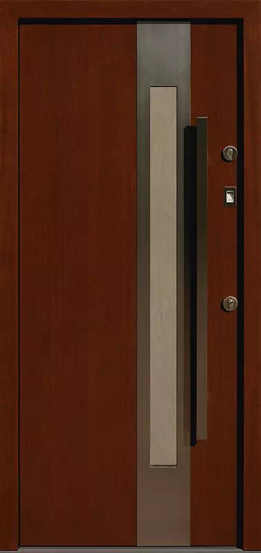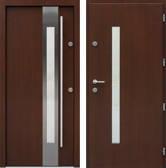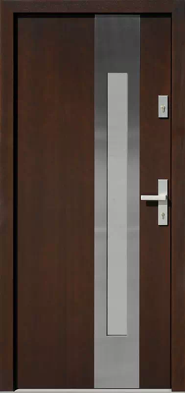Najczęściej sprzedawany model drzwi z całej kolekcji inox. Powyższy, przykładowy egzemplarz drzwi zewnętrznych został wymalowany na kolor: orzech.