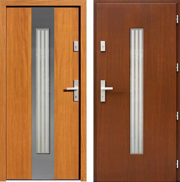 Jest on zwykle wybierany do tzw. „nowoczesnych” domów z symetrycznym wejściem. Powyższy, przykładowy egzemplarz drzwi zewnętrznych został wymalowany na kolor: złoty dąb + orzech.