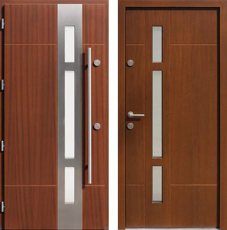 Te nieco bardziej bogatsza, urozmaicona forma wzornicza znajduje wielu klientów i ten model drzwi jest modelem dosyć często zamawianym do domów o nowoczesnej, formie stylistycznej. Powyższy, przykładowy egzemplarz drzwi zewnętrznych został wymalowany na kolor: orzech.