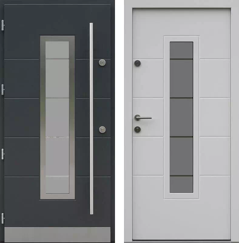 Ramka z blachy inox może mieć zmodyfikowaną szerokość i może również być zamontowana po obu stronach skrzydła drzwiowego. Powyższy, przykładowy egzemplarz drzwi zewnętrznych został wymalowany na kolor: antracyt + białe.