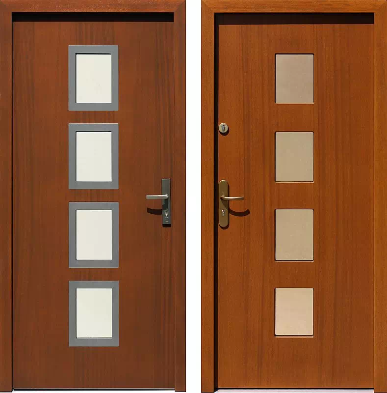 Przeszklenia zastosowane w tym modelu drzwi zewnętrznych, bardzo dobrze doświetlają pomieszczenia znajdujące się za drzwiami i jednocześnie zapewniają mieszkańcom poczucie bezpieczeństwa podczas ich użytkowania. Standardowo stosowane szyby refleksyjne, dobrze odbijają światło od zewnątrz i praktycznie uniemożliwiają wgląd z zewnątrz do wnętrza domu, a przy tym pozwalają na bardzo dobrą obserwacje zewnętrznego otoczenia z wnętrza domu. Ze względu na nowoczesną formę modelu 497,1 i zastosowane aplikacje ze stali nierdzewnej polecamy skompletowanie klamek i rozet w kolorze INOX. Powyższy, przykładowy egzemplarz drzwi zewnętrznych został wymalowany na kolor: ciemny dąb.