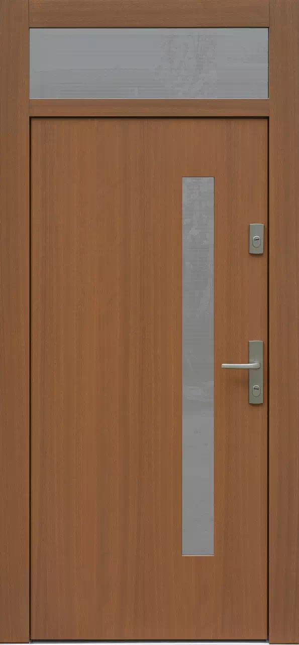 Szerokość przeszklenia skrzydła drzwiowego oraz jego położenie mogą być zmienione. Możliwa jest także zmiana kierunku usłojenia na poziome zamiast pionowego. Powyższy, przykładowy egzemplarz drzwi zewnętrznych został wymalowany na kolor: winchester.