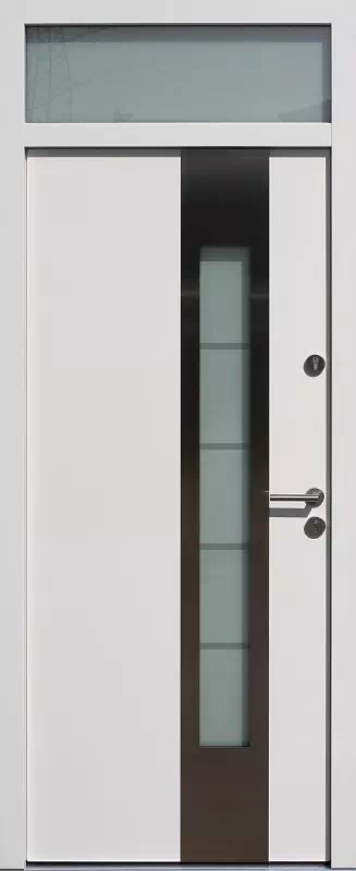 W tych drzwiach została zastosowana szyba piaskowana gładka w naświetlu górnym, oraz piaskowana 2D w skrzydle głównym (poziome paski szer 11 mm są lekko lustrzane i przezierne od wnętrza domu). Powyższy, przykładowy egzemplarz drzwi zewnętrznych został wymalowany na kolor: białe.