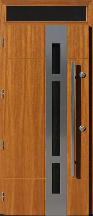 Trzy szyby skrzydła głównego z zewnętrznej strony obramowane są obramowaniami z kwasoodpornej blachy inox grubości 1,5 mm. Powyższy, przykładowy egzemplarz drzwi zewnętrznych został wymalowany na kolor: złoty dąb.