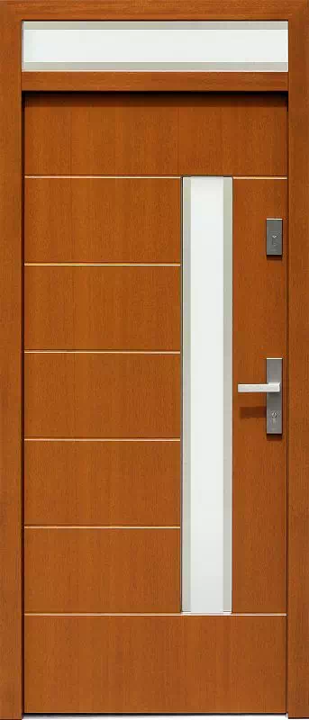 Wzór nie stanowi zamkniętego wzornictwa i mogą być w nim modyfikowane zarówno wymiary szyby jak i ilość i rozmieszczenie przefrezowań. Powyższy, przykładowy egzemplarz drzwi zewnętrznych został wymalowany na kolor: złoty dąb.