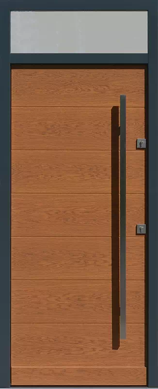 Ilość i szerokość przefrezowań może w bardzo szerokim zakresie modyfikowana. Powyższy, przykładowy egzemplarz drzwi zewnętrznych został wymalowany na kolor: ciemny dąb + antracyt.