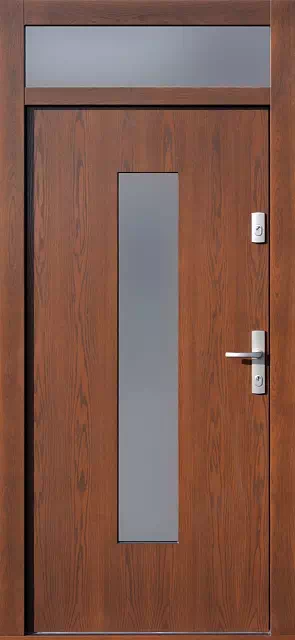 Wymiary naświetla oraz kolor szyby mogę być zmienione w bardzo szerokim zakresie. Alternatywnie w tym modelu drzwi może być zastosowana blacha inox na dole skrzydła drzwiowego (tzw kopacz). Powyższy, przykładowy egzemplarz drzwi zewnętrznych został wymalowany na kolor: orzech.