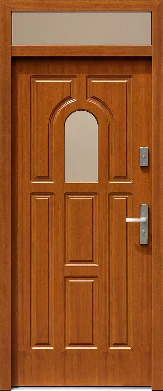 Niewielkie, klasyczne przeszklenie na skrzydle zwykle jest szklone szybą w tym samym kolorze co naświetle górne. Powyższy, przykładowy egzemplarz drzwi zewnętrznych został wymalowany na kolor: złoty dąb.