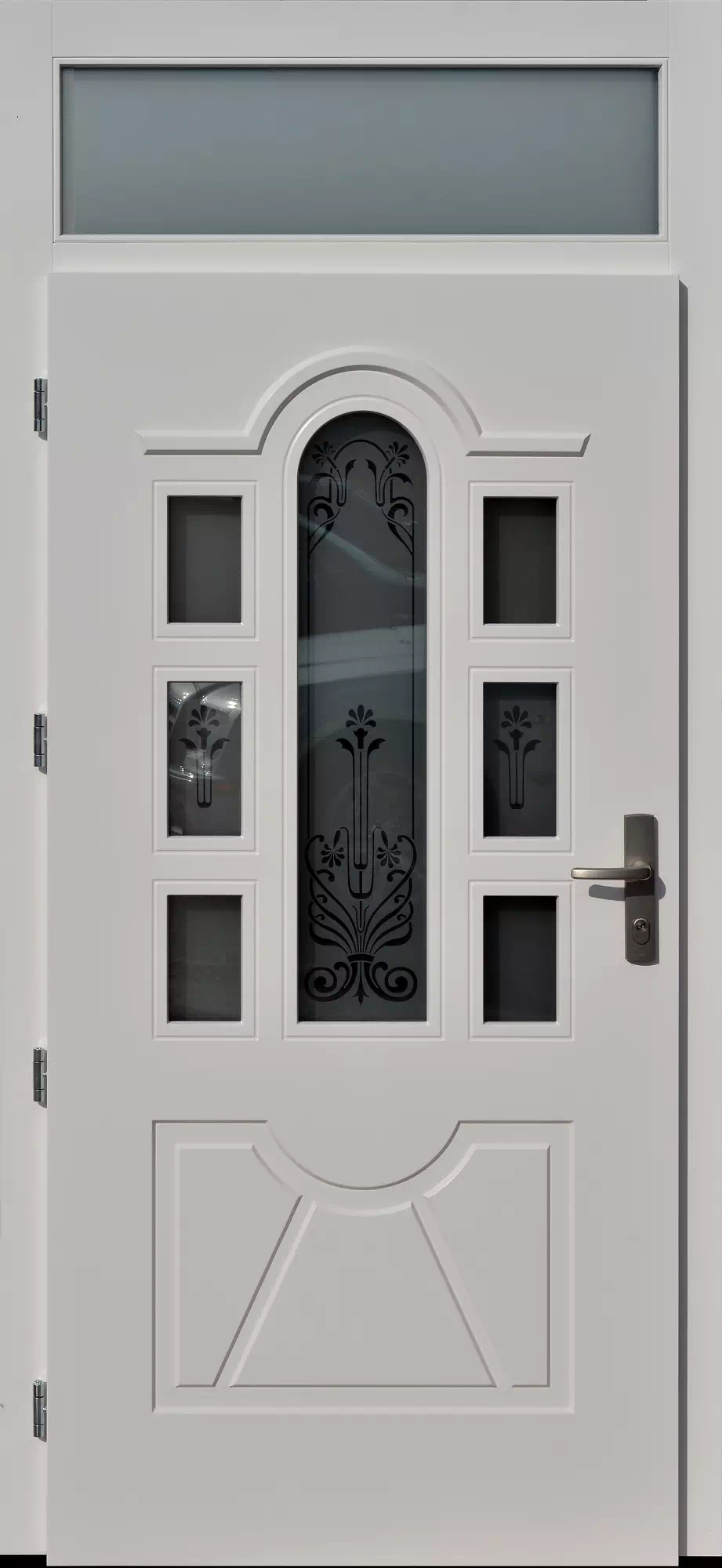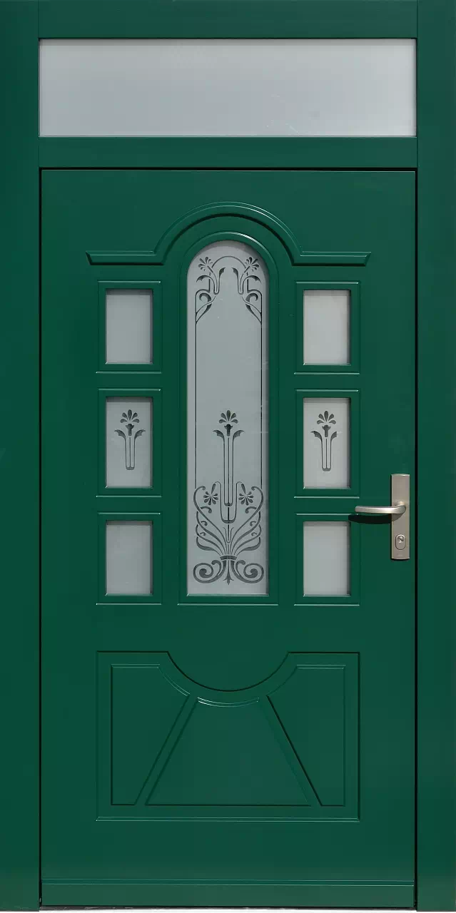 Bogaty wzorniczo model drzwi zbudowany z kombinacji małych prostokątnych szybek i pojedynczej, większej usytuowanej centralnie. Powyższy, przykładowy egzemplarz drzwi zewnętrznych został wymalowany na kolor: zielone.