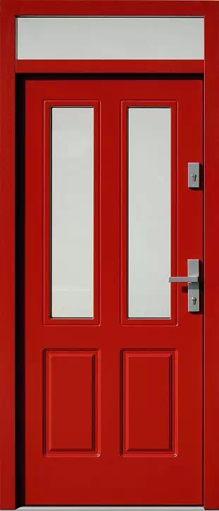 Kolor przeszkleń skrzydła głównego oraz naświetla górnego standardowo są w tym samym kolorze. Powyższy, przykładowy egzemplarz drzwi zewnętrznych został wymalowany na kolor: czerwone.
