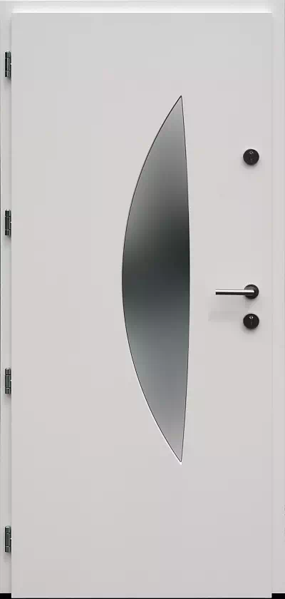 Kształtowy model szyby i jej wymiary mogą być zmodyfikowane w bardzo dużym zakresie. Powyższy, przykładowy egzemplarz drzwi zewnętrznych został wymalowany na kolor: białe.