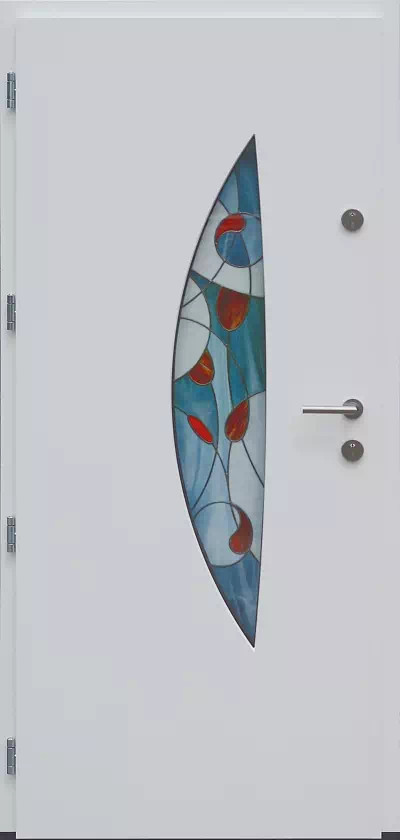 Ta kształtowa szyba z witrażem wykonanym w tradycyjnej technologii jest jedynym ozdobnym elementem skrzydła drzwiowego. Powyższy, przykładowy egzemplarz drzwi zewnętrznych został wymalowany na kolor: białe.