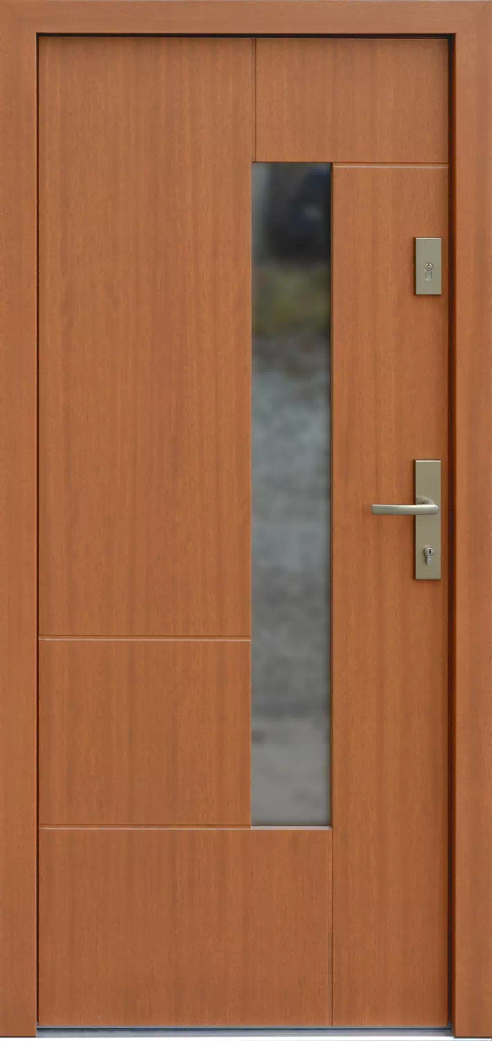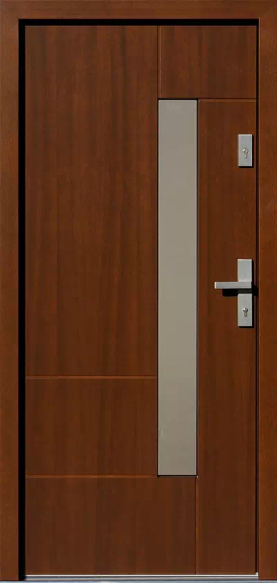 Jest ona zalecana w przypadku wykonywania tego wzoru drzwi z drewna mahoń-merantii ponieważ ten gatunek drewna ma znacząco różną jasność w zależności od kierunku usłojenia. Powyższy, przykładowy egzemplarz drzwi zewnętrznych został wymalowany na kolor: ciemny dąb.