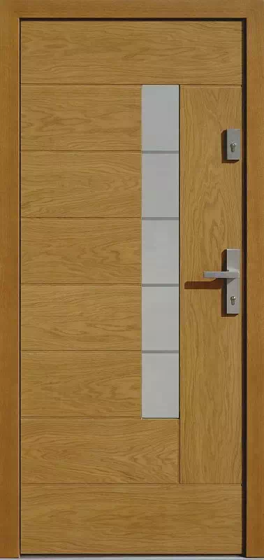 Przezierne poziome paski na szybie stanowią przedłużenie "szczelin" pomiędzy poszczególnymi "deskami". Powyższy, przykładowy egzemplarz drzwi zewnętrznych został wymalowany na kolor: dab średni.