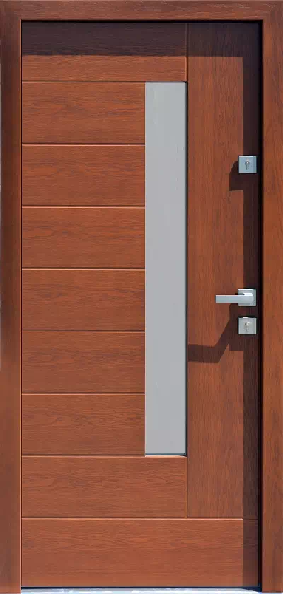 Dosyć duża szyba wpuszcza znaczne ilości światła do wnętrza domu (w szczególności jeżeli drzwi zostaną zamówione z szybami bezbarwnymi lub bezbarwnymi-reflex). Powyższy, przykładowy egzemplarz drzwi zewnętrznych został wymalowany na kolor: ciemny dąb.