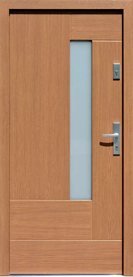 Szyba zapewnia dobrą widoczność zewnętrznego otoczenia z wnętrza domu i jednocześnie dosyć dobrze Powyższy, przykładowy egzemplarz drzwi zewnętrznych został wymalowany na kolor: wincheter.