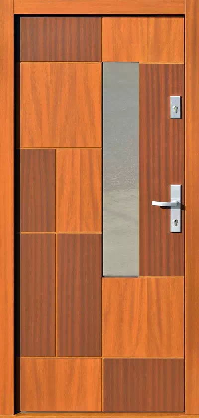 Kształty i kolory poszczególnych pól jak i ich wymiary mogą być regulowane/modyfikowane w bardzo dużym zakresie. Powyższy, przykładowy egzemplarz drzwi zewnętrznych został wymalowany na kolor: złoty dąb + sapelli.