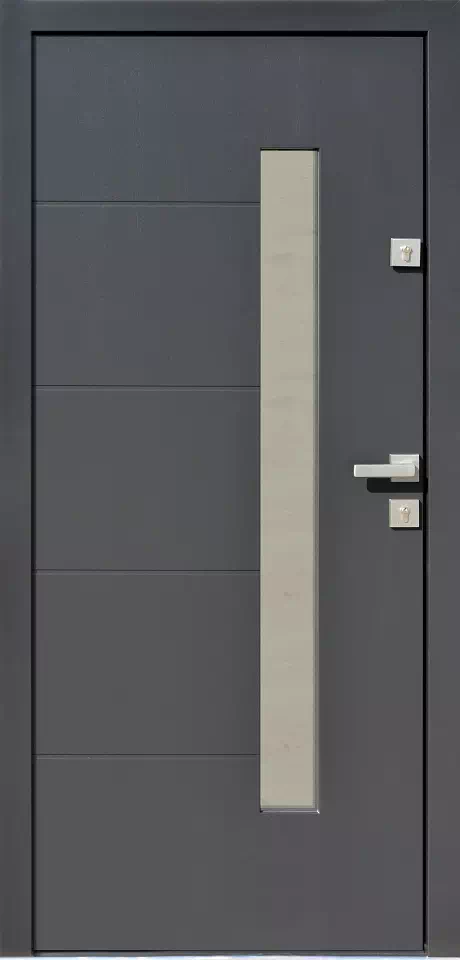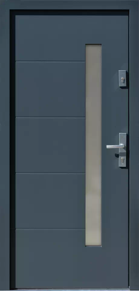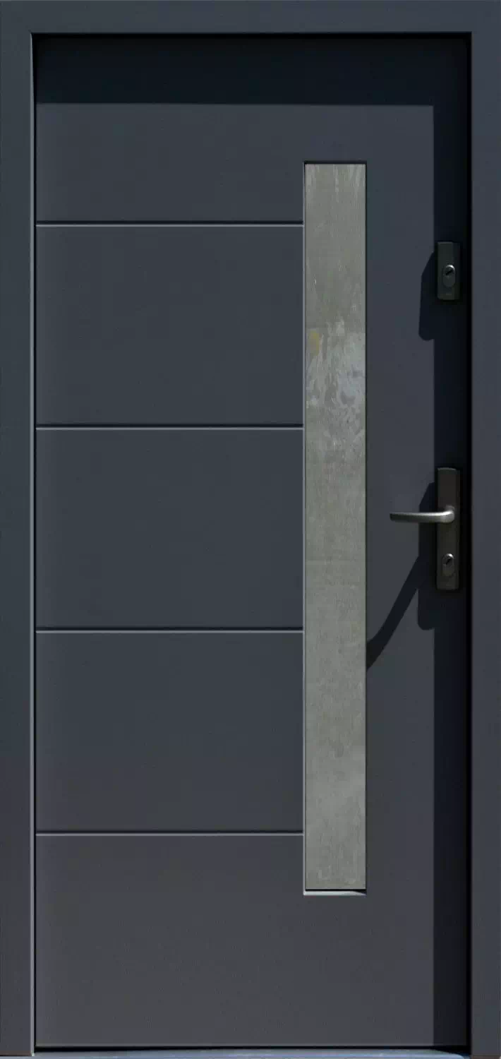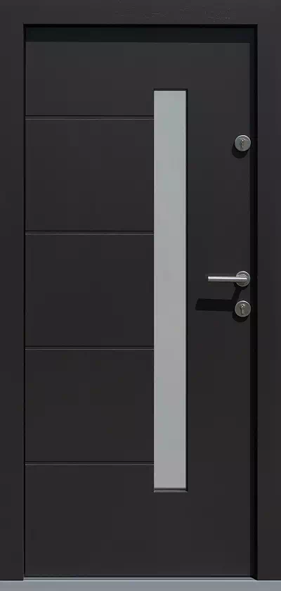 Ilość rowków, ich szerokość i rozstaw tak i wymiary samego przeszklenia mogą być „prawie dowolnie” modyfikowane. Powyższy, przykładowy egzemplarz drzwi zewnętrznych został wymalowany na kolor: czarne.