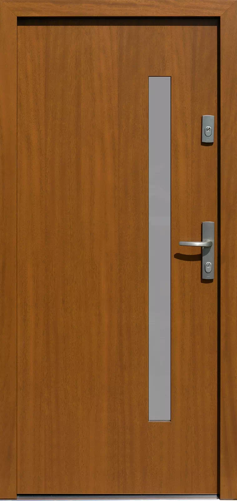 Różnice pomiędzy nimi ograniczają się do wymiarów i położenia szyby. Powyższy, przykładowy egzemplarz drzwi zewnętrznych został wymalowany na kolor: złoty dąb.