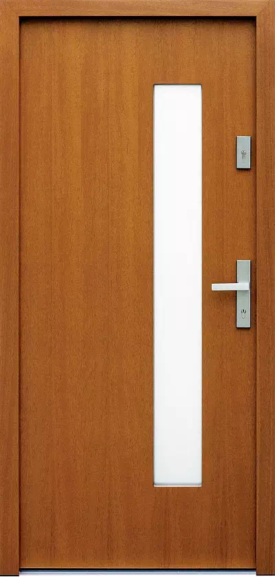 Różnice pomiędzy poszczególnymi modelami ograniczają się do wymiarów i położenia szyby. Powyższy, przykładowy egzemplarz drzwi zewnętrznych został wymalowany na kolor: dąb ciemny.