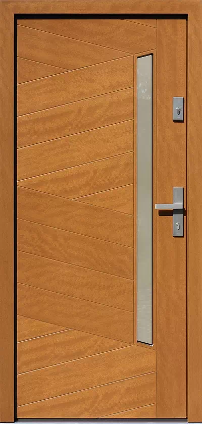 Trapezowa szyba i skośnie położone "deski" składają się na artystyczną kompozycje tego wzoru drzwi zewnętrznych. Powyższy, przykładowy egzemplarz drzwi zewnętrznych został wymalowany na kolor: jasny dąb.