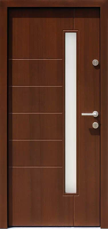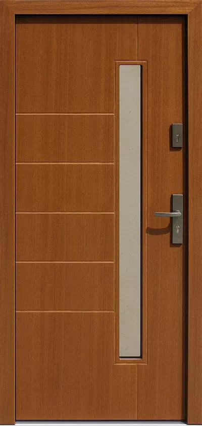 Szyba niewielkiej szerokości dostatecznie doświetla wnętrze domu i umożliwia obserwacje otoczenia przed domem z jego wnętrza. Powyższy, przykładowy egzemplarz drzwi zewnętrznych został wymalowany na kolor: złoty dąb.
