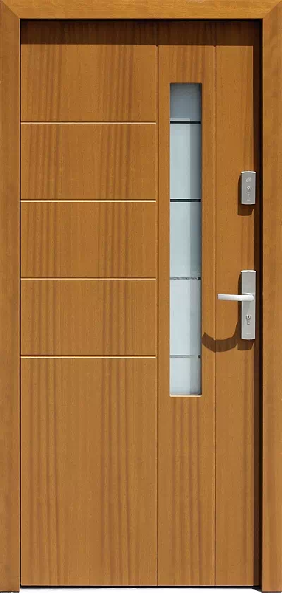Szyby w tych drzwiach maja wąskie poziome szczeliny przez które możliwa jest obserwacja okolicy przed domem z jego wnętrza oraz utrudnione obserwowanie wnętrza domu z zewnątrz. Powyższy, przykładowy egzemplarz drzwi zewnętrznych został wymalowany na kolor: złoty dąb.