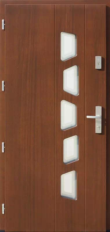 Szyby w tych drzwiach mają centralne pola przyciemnione ale przezierne, natomiast obwódki dookoła tych pól są piaskowane w dwu rożnych odcieniach. Powyższy, przykładowy egzemplarz drzwi zewnętrznych został wymalowany na kolor: złoty dąb.