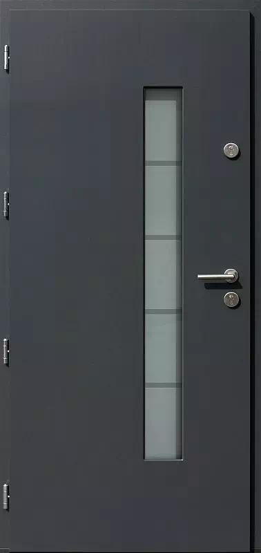 Poziome paski są przyciemnione w odcieniu grafitowym i lekko lustrzane (efekt lustra weneckiego) i umożliwiają obserwację na zewnątrz domu w którym zostały zamontowane. Powyższy, przykładowy egzemplarz drzwi zewnętrznych został wymalowany na kolor: antracyt.