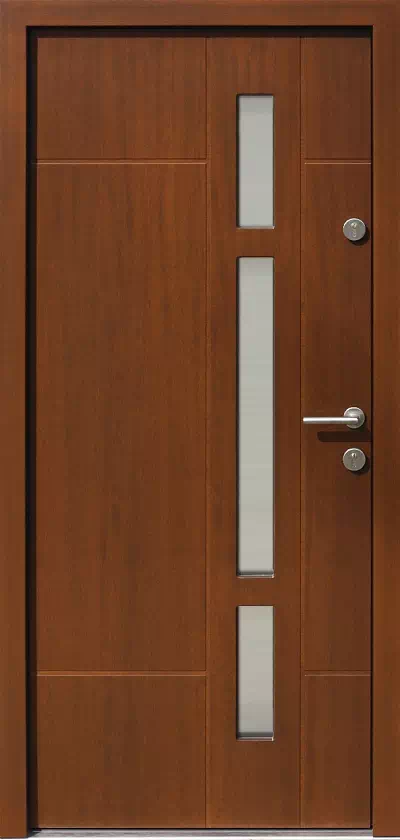 Długa, wąska szyba przedzielona 3 poziomymi szprosami, oraz kilka prostych pionowych i poziomych przefrezowań składają się ten często produkowany wzór drzwi. Powyższy, przykładowy egzemplarz drzwi zewnętrznych został wymalowany na kolor: orzech.