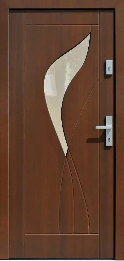 Krzywoliniowe przefrezowania wypełniające przestrzenie dookoła szyby imitują gałązki roślinne. Całość wzoru jest ograniczona prostokątnym obramowaniem. Powyższy, przykładowy egzemplarz drzwi zewnętrznych został wymalowany na kolor: ciemny orzech.