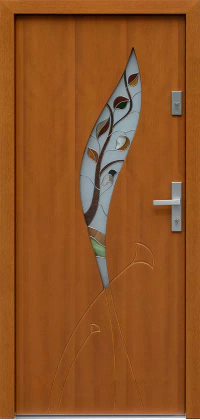 Ta kolorowa ozdobna szyba jest głównym elementem ozdobnym tego modelu drzwi. Powyższy, przykładowy egzemplarz drzwi zewnętrznych został wymalowany na kolor: ciemny dąb.