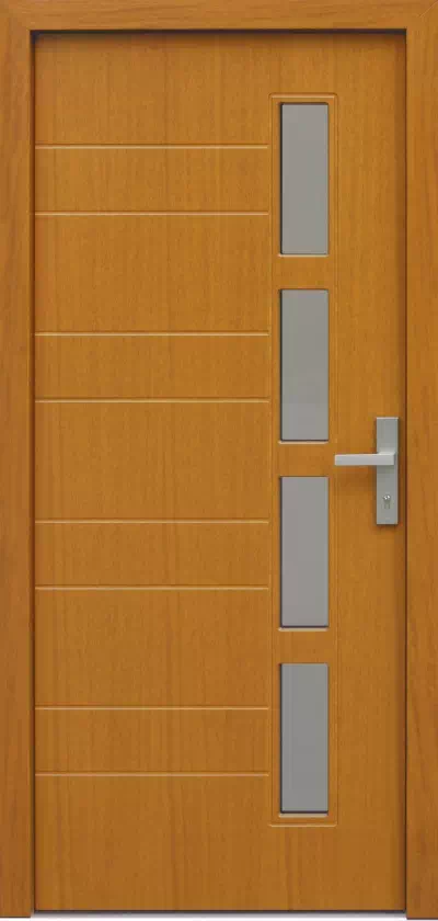 Obwódki dookoła szyb i poziome paski uzupełniają kompozycje tego modelu drzwi. Powyższy, przykładowy egzemplarz drzwi zewnętrznych został wymalowany na kolor: złoty dąb.