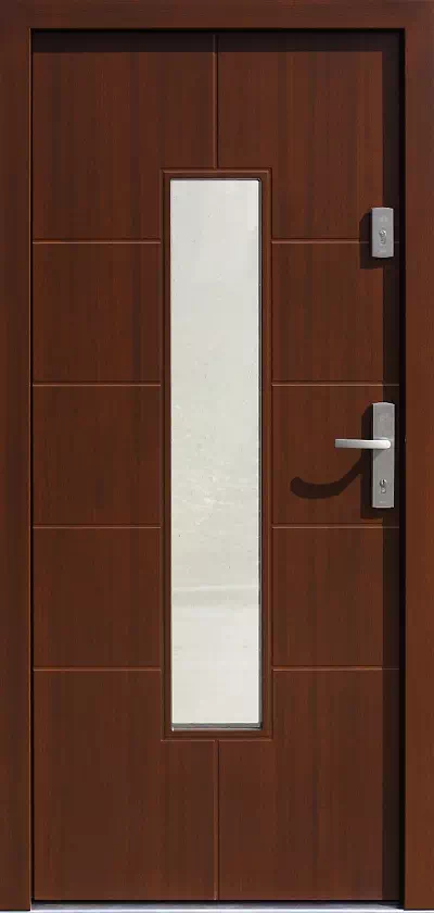 Szerokość szyby jak i ilość, kształt pasków dookoła szyby mogą być indywidualnie zmodyfikowana po uzgodnieniu z klientem. Powyższy, przykładowy egzemplarz drzwi zewnętrznych został wymalowany na kolor: orzech ciemny.