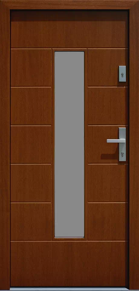Szerokość przefrezowań standardowo ma szerokość 9 mm, ale może być znacząco zwiększona. Powyższy, przykładowy egzemplarz drzwi zewnętrznych został wymalowany na kolor: ciemny dąb.