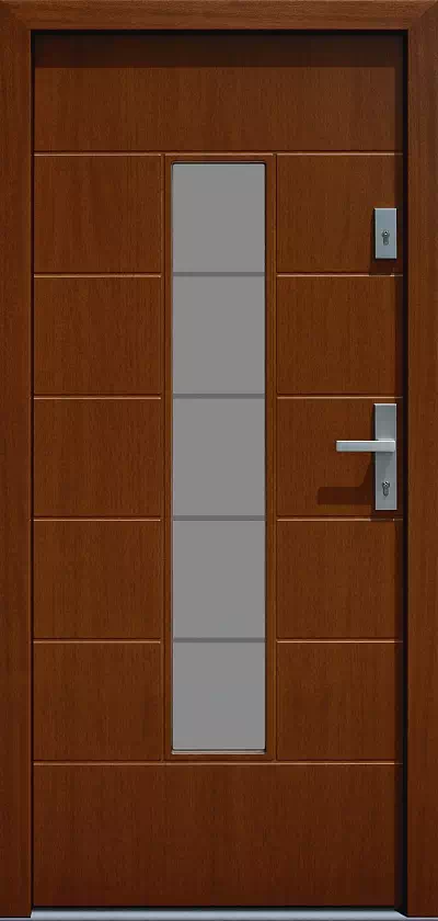 Szyba ta charakteryzuje się 4 poziomymi , przeziernymi paskami o szerokości 11 mm. Umożliwiają one dobrą obserwację otoczenia przed drzwiami. Powyższy, przykładowy egzemplarz drzwi zewnętrznych został wymalowany na kolor: ciemny dąb.