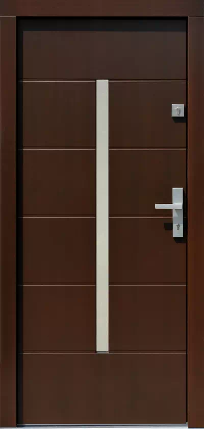 Szerokość szyby oraz pasków tak jak ich ilość mogę w bardzo dużym zakresie modyfikowane. Powyższy, przykładowy egzemplarz drzwi zewnętrznych został wymalowany na kolor: ciemny orzech.