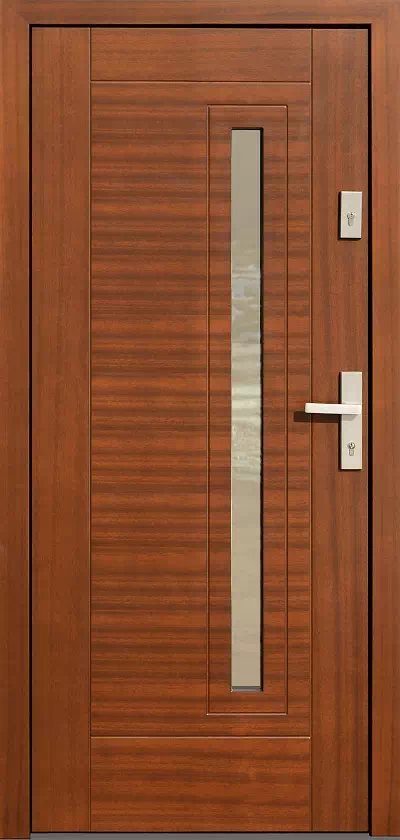 Pionowy i poziomy układ usłojenia zastosowany w nim przydaje mu klasycznego charakteru. Powyższy, przykładowy egzemplarz drzwi zewnętrznych został wymalowany na kolor: teak.