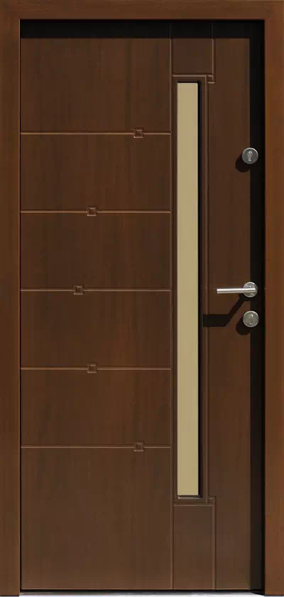 Siedem małych kwadracików rozmieszczonych po fragmencie okręgu nadaje niepowtarzalnego charakteru temu wzorowi. Powyższy, przykładowy egzemplarz drzwi zewnętrznych został wymalowany na kolor: orzech.