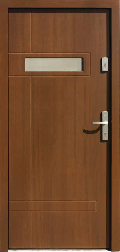 Drzwi mogą być zamontowane jako zewnętrzne w domkach jednorodzinnych i wejściowe w budynkach wielorodzinnych. Powyższy, przykładowy egzemplarz drzwi zewnętrznych został wymalowany na kolor: orzech.