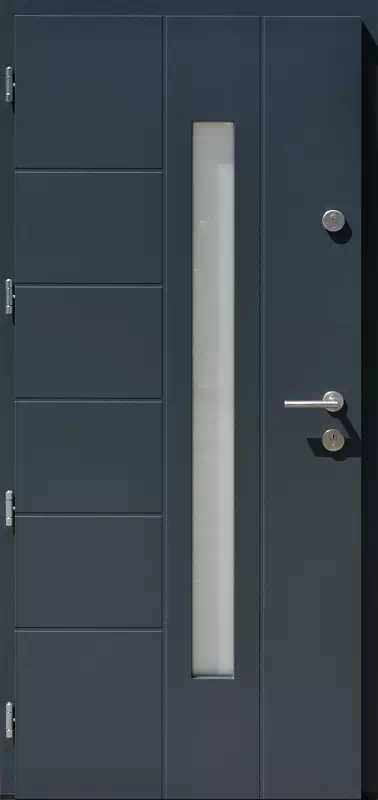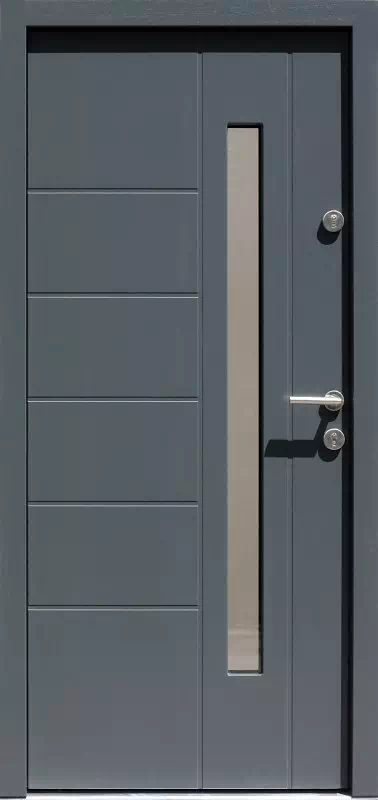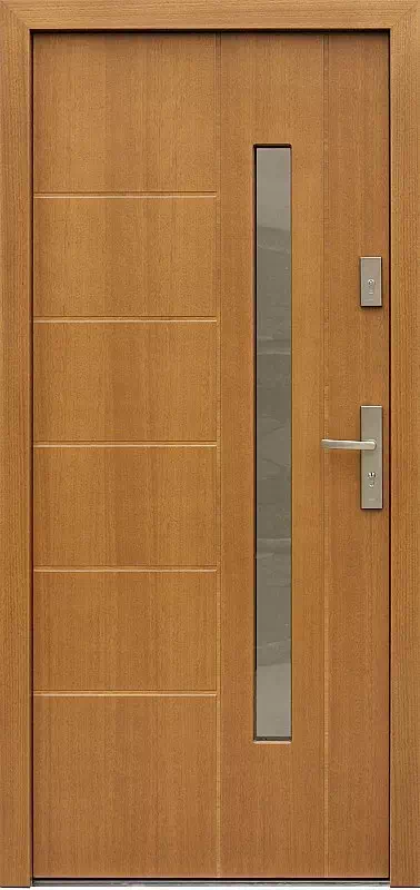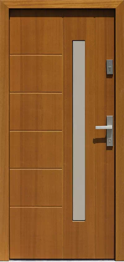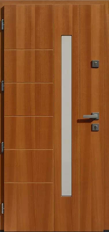 Charakteryzuje się umiarkowanej szerokości szybą i pięcioma poziomymi przefrezowaniami od strony zawiasów. Powyższy, przykładowy egzemplarz drzwi zewnętrznych został wymalowany na kolor: złoty dąb.