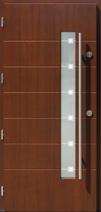 Poziome paski i wąskie obwódki dookoła kwadratów są przezierne. Powyższy, przykładowy egzemplarz drzwi zewnętrznych został wymalowany na kolor: orzech.