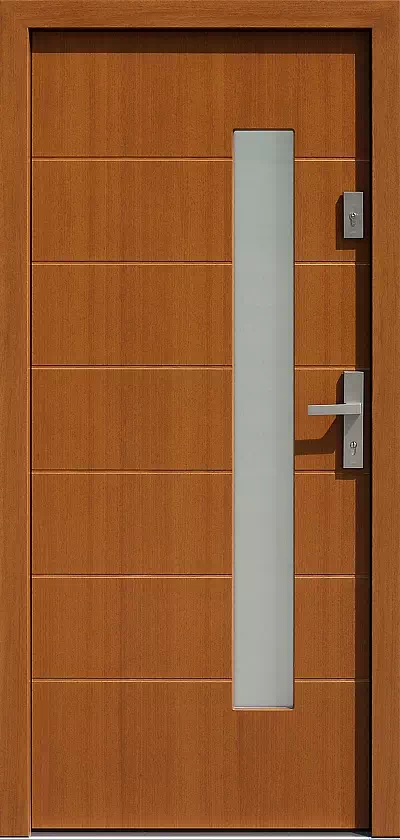 Model drzwi zewnętrznych zaprojektowany ze szczególną dedykacją do nowych domów jednorodzinnych. Powyższy, przykładowy egzemplarz drzwi zewnętrznych został wymalowany na kolor: złoty dąb.