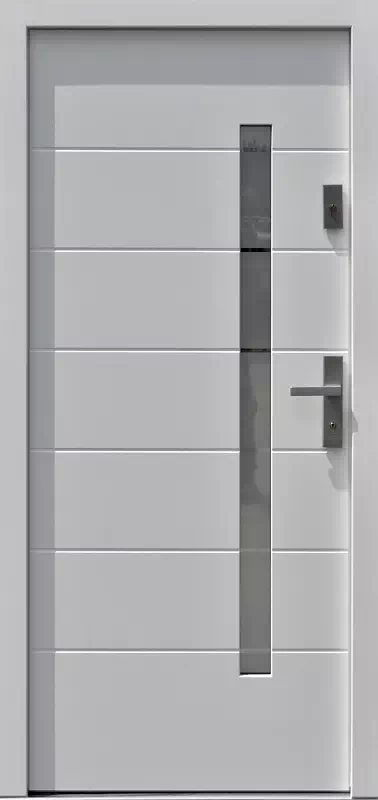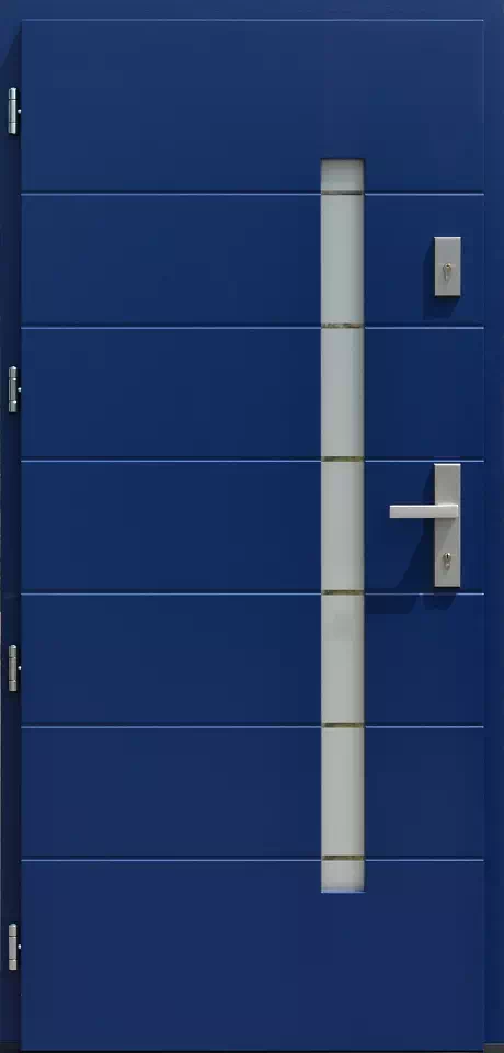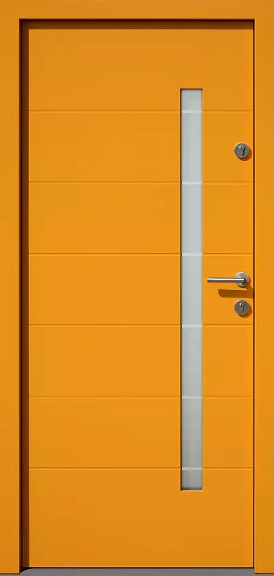 Sześć poziomych, przeziernych pasków na szybie umożliwia dobrą obserwację otoczenia przed domem z jego wnętrza i tworzy jednocześnie ładną kompozycje z poziomymi paskami na skrzydle drzwiowym. Powyższy, przykładowy egzemplarz drzwi zewnętrznych został wymalowany na kolor: zółte.