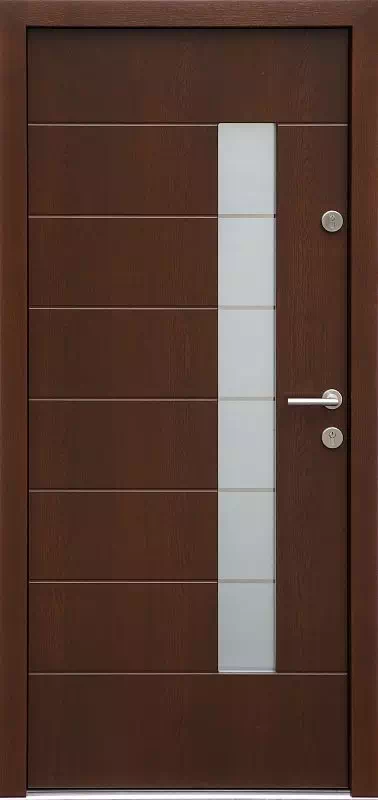Pięć poziomych pasków szerokości 1 cm (lekko lustrzanych od zewnątrz ale przeziernych od wewnątrz) umożliwia dobrą obserwację otoczenia przed domem. Powyższy, przykładowy egzemplarz drzwi zewnętrznych został wymalowany na kolor: orzech ciemny.
