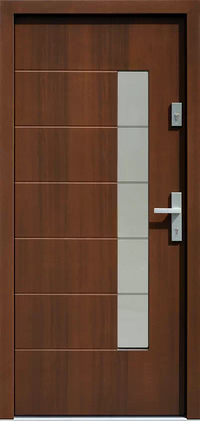 Cztery poziome paski o szerokości 1 cm (lekko lustrzanych od zewnątrz ale przeziernych od wewnątrz) umożliwia dobrą obserwację otoczenia przed domem z jego wnętrza. Powyższy, przykładowy egzemplarz drzwi zewnętrznych został wymalowany na kolor: orzech.
