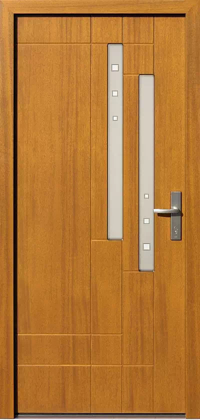 Obwódki dookoła kwadracików są lekko przyciemnione ale przezierne i umożliwiają dobrą obserwację otoczenia przed domem z jego wnętrza. Powyższy, przykładowy egzemplarz drzwi zewnętrznych został wymalowany na kolor: ciemny dąb.