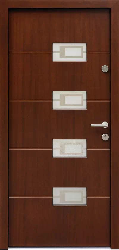Prostokątne ramki i ich poziome przedłużenia są lustrzane i lekko przyciemnione, ale jednocześnie przezierne i umożliwiają dobrą obserwację otoczenia przed domem z jego wnętrza. Powyższy, przykładowy egzemplarz drzwi zewnętrznych został wymalowany na kolor: orzech.